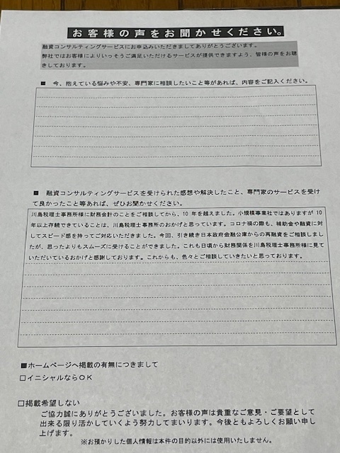 ご多分に漏れず資金繰りに悩んでいたところ、長年お世話になっている川島税理士から最新情報を元に適切なアドバイスを頂き半信半疑でしたがお願いしました。結果、資料の作成も手伝って頂き、予想より早く融資を受けることができました。金融機関との日頃の信頼関係があっての事だと思いますが大変助かり感謝しております。
